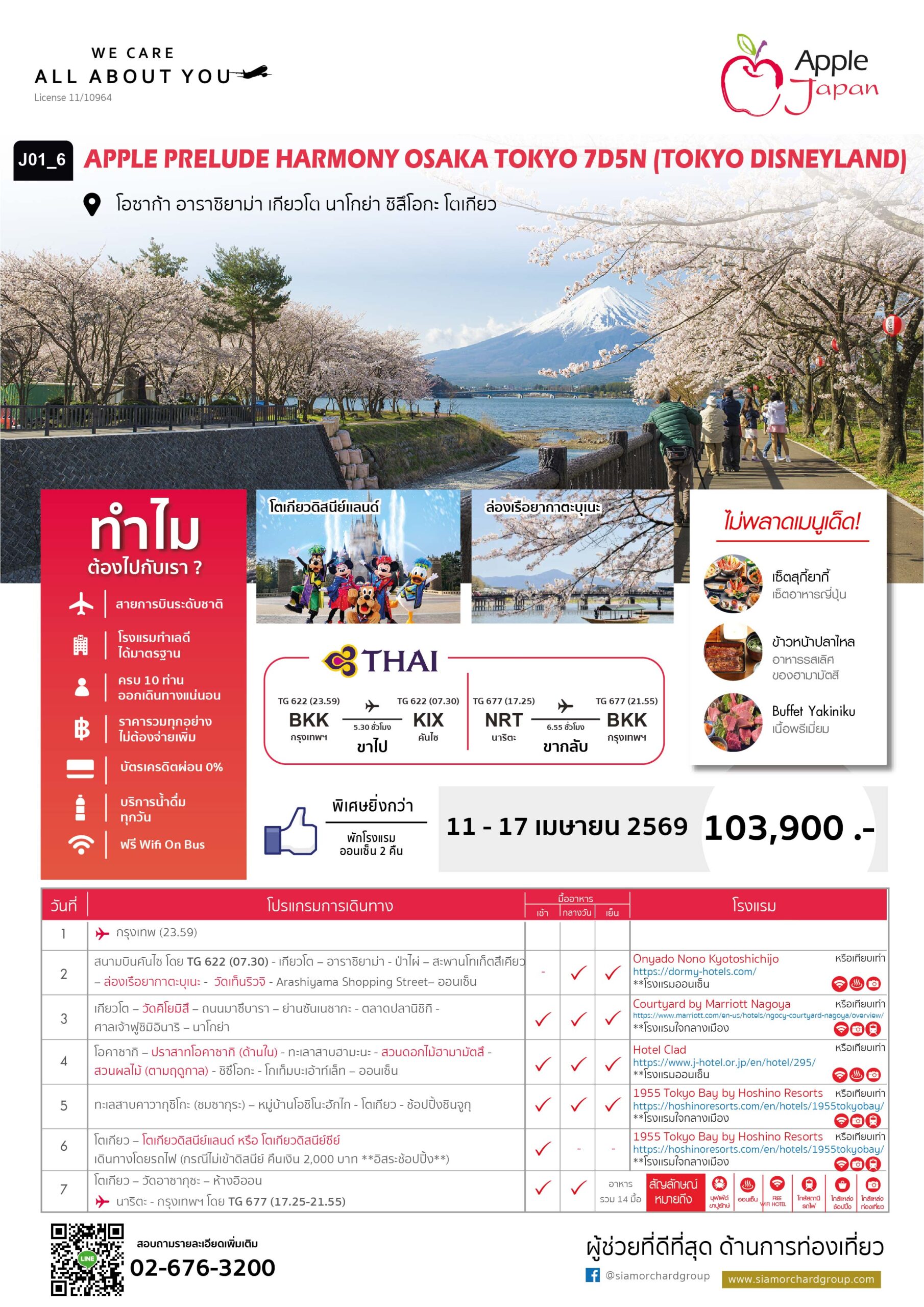 ทัวร์ญี่ปุ่น เดือนเมษายน 2569 APPLE PRELUDE HARMONY OSAKA TOKYO 7D5N (TOKYO DISNEYLAND)