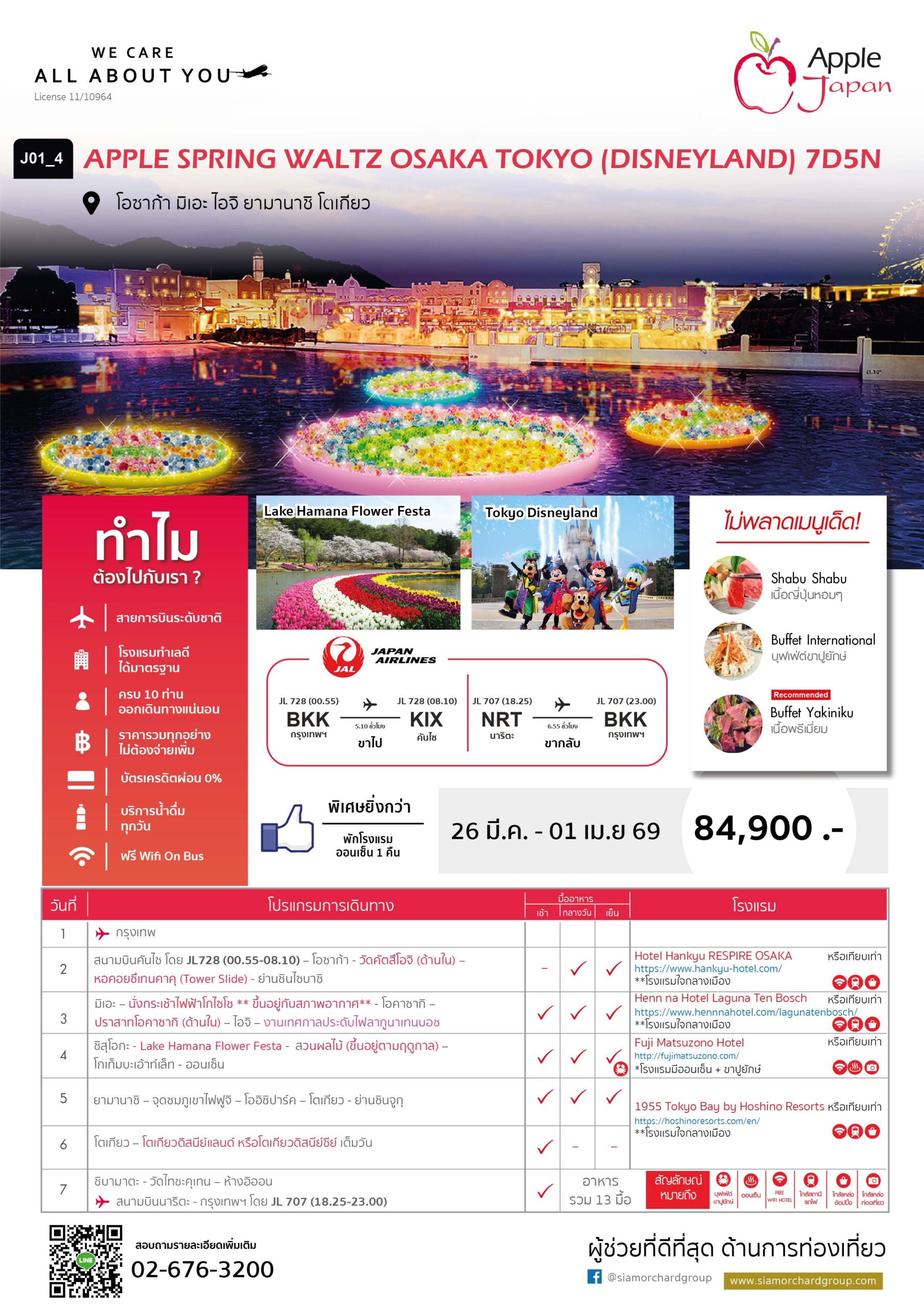 ทัวร์ญี่ปุ่น เดือนมีนาคม 2569 APPLE SPRING WALTZ OSAKA TOKYO 7D5N (DISNEYLAND)