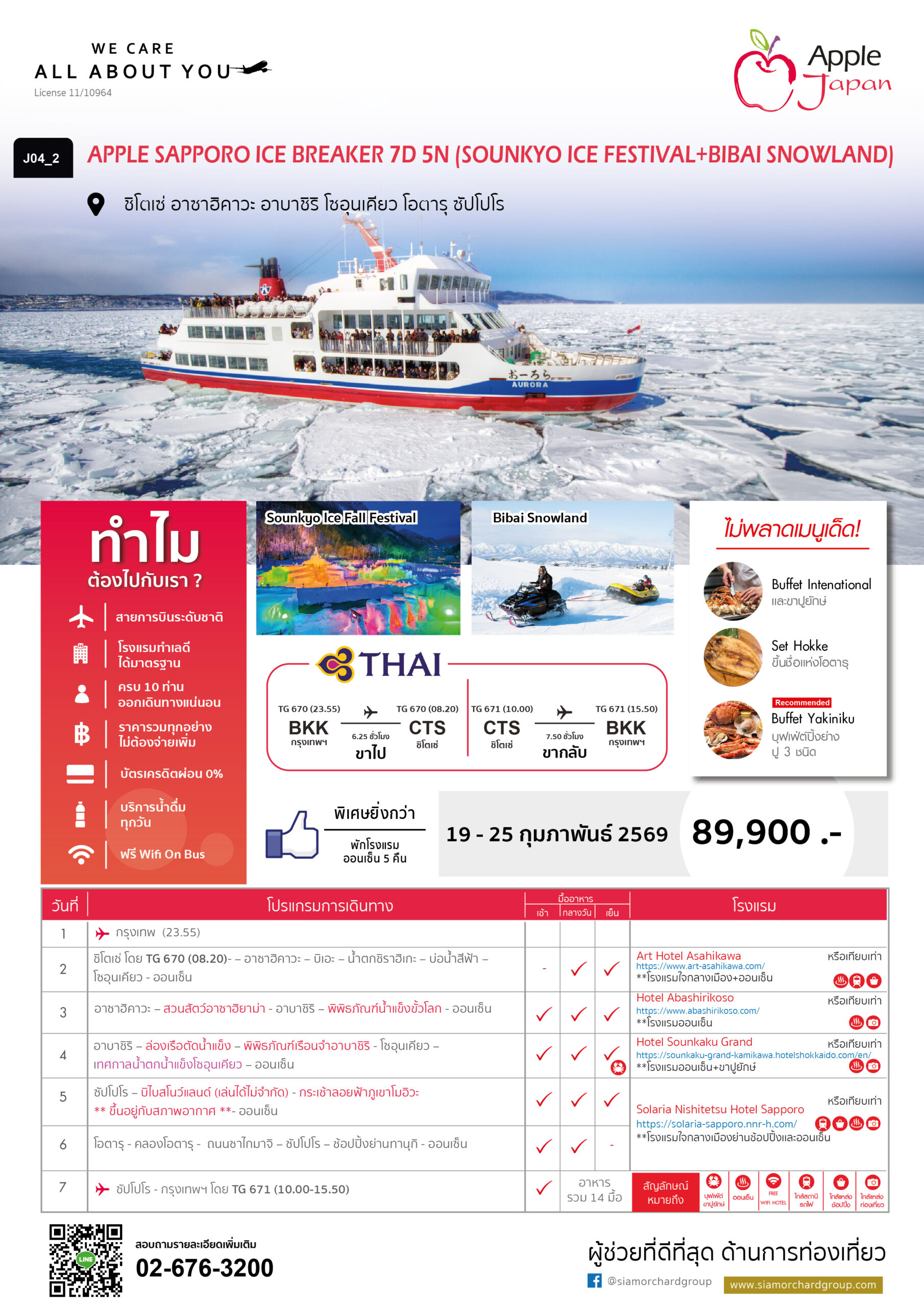 ทัวร์ญี่ปุ่น เดือนกุมภาพันธ์ 2569 APPLE SAPPORO ICE BREAKER 7D5N (SOUNKYO ICE FESTIVAL+BIBAI SNOWLAND)