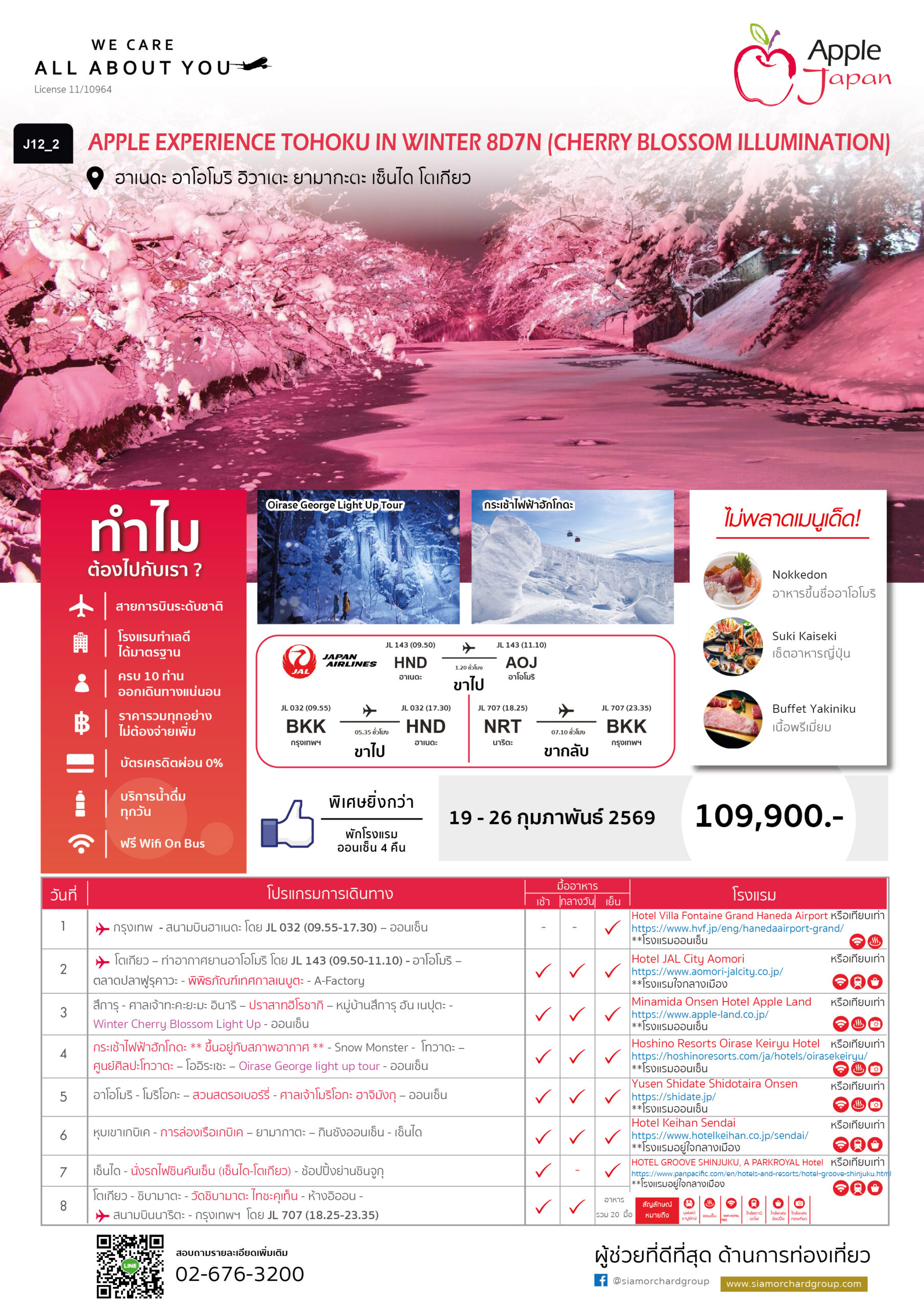 ทัวร์ญี่ปุ่น เดือนกุมภาพันธ์ 2569 APPLE EXPERIENCE TOHOKU IN WINTER 8D7N (CHERRY BLOSSOM ILLUMINATION)