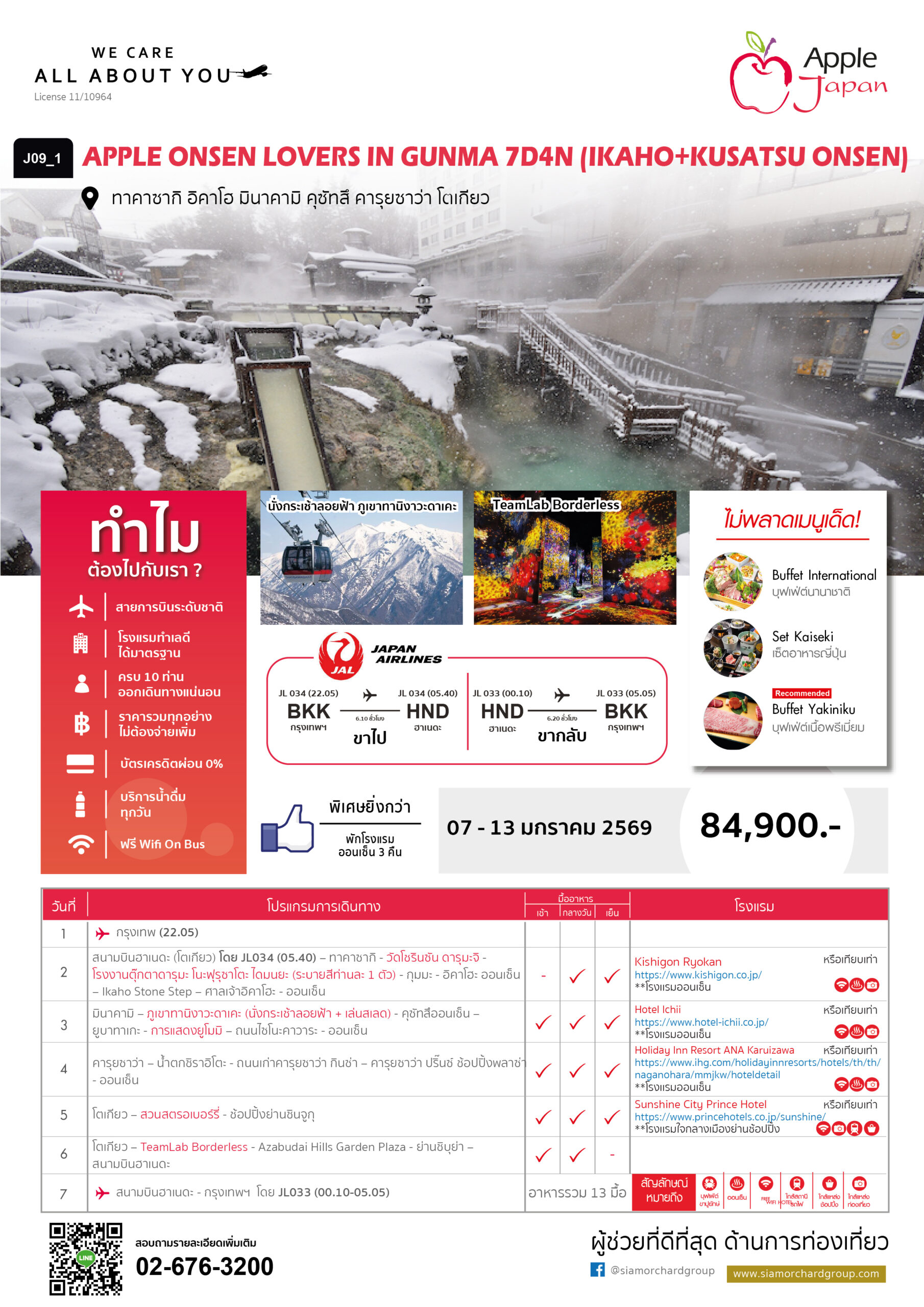 ทัวร์ญี่ปุ่น เดือนมกราคม 2569 APPLE ONSEN LOVERS IN GUNMA 7D4N (IKAHO+KUSATSU ONSEN)